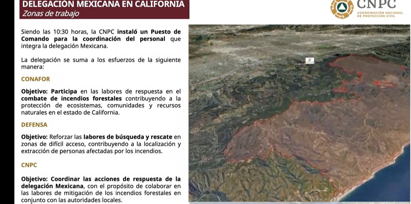 El sábado 11 de enero 2 aeronaves de la fuerza aérea mexicana llegaron al territorio, con Defensa, Conafor, SRE y la Coordinación Nacional Protección Civil para apoyar. Se trata de 72 elementos especializado y primera delegación especial en sumarse a combatir los incendios en California.