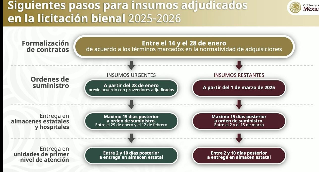 Este martes 14 de enero se estará notificando a los proveedores sobre el resultado de las licitaciones, agregó el funcionario y los dictámenes técnicos se publicarán en Compranet. Las fechas de entrega serán a partir del 14 de marzo, en enero y febrero se entregarán piezas de emergencia.