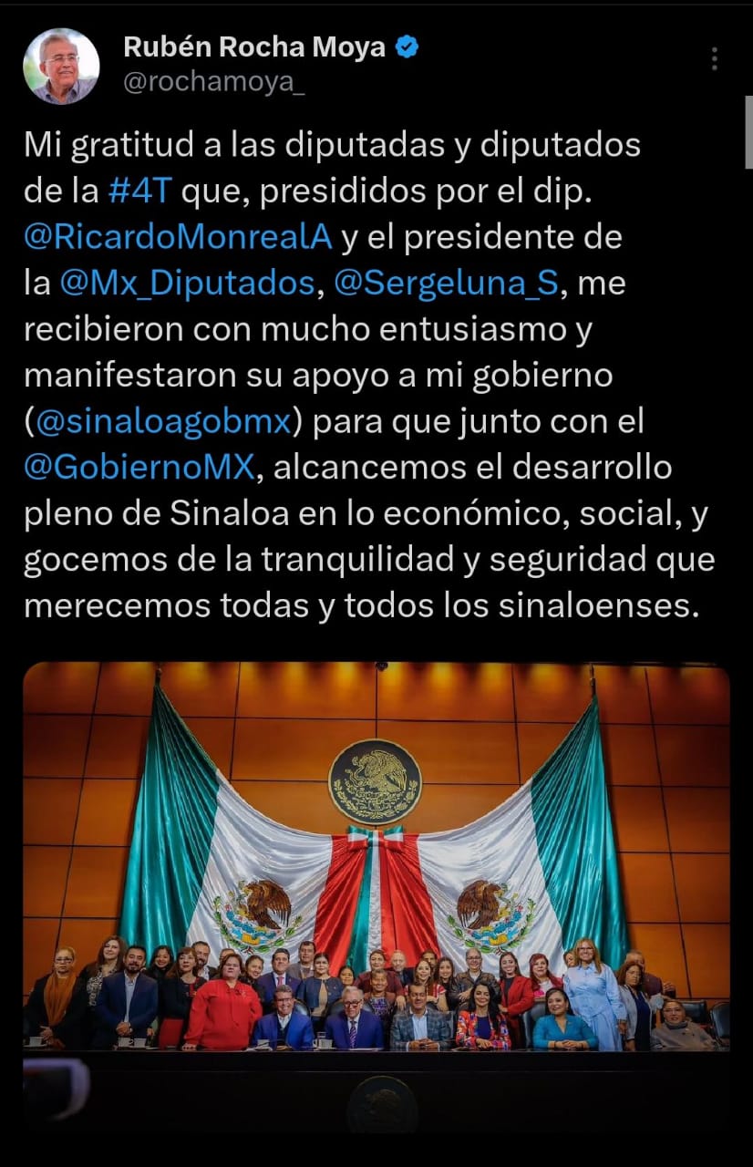 Ciudad de México. – Durante su visita de este jueves a la Ciudad de México, el gobernador Rubén Rocha Moya acudió tanto a la Cámara de Senadores como a la Cámara de Diputados, donde se reunió con los miembros del Grupo Parlamentario de Morena y aliados, en ambas cámaras, para abordar en una charla con los legisladores federales sobre la situación que enfrenta actualmente Sinaloa.