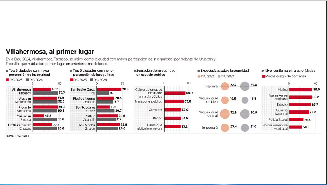 En esta última encuesta el primer lugar lo ocupa Villahermosa, Tabasco, donde la percepción de inseguridad creció en un año 25.8 puntos porcentuales, al pasar de 69.5 en diciembre de 2023 a 95.3 en diciembre de 2024.