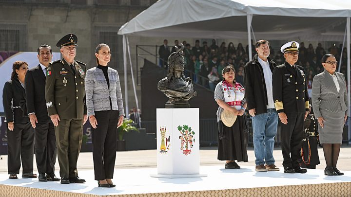 Cuauhtémoc, Ciudad de México. 28 de febrero 2025. La presidenta constitucional de los Estados Unidos Mexicanos, la Doctora Claudia Sheinbaum Pardo en Funerales de Estado. 500 Años de la Ejecución de Cuauhtémoc. Acompañan a la presidenta: Antonio Esteva Medina, secretario de Infraestructura, Comunicaciones y Transportes; Citlalli Hernández Mora, secretaria de la Secretaría de las Mujeres; Juan Ramón de la Fuente, secretario de Relaciones Exteriores; ; Ernestina Godoy Ramos, consejera jurídica del Ejecutivo Federal; Sergio Carlos Gutiérrez Luma, presidente de la mesa directiva de la Cámara de Diputados; Rosa Icela Rodríguez Velázquez, secretaria de Gobernación; Ricardo Trevilla Trejo, secretario de la Defensa Nacional; Raymundo Pedro Morales, secretario de Marina; Clara Brugada, Jefa de Gobierno de la Ciudad de México; José Gerardo Fernández Noroña, presidente de la mesa directiva de la Cámara de Senadores; Luz Elena González Escobar, secretaria de Energía; Mario Delgado Carrillo, secretario de Edución Pública; Raquel Buenrostro Sánchez, secretaria Anticorrupción y de Buen Gobierno. Foto: Presidencia