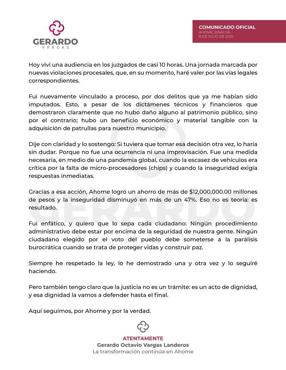 “Sigo confiando en las autoridades”, precisó tajante Gerardo Vargas Landeros a su salida del Juzgado tras más de 10 horas de audiencia en la que se le dictó vinculación a proceso junto a 9 exfuncionarios y funcionarios del municipio de Ahome por supuestas irregularidades en la renta de patrullas.