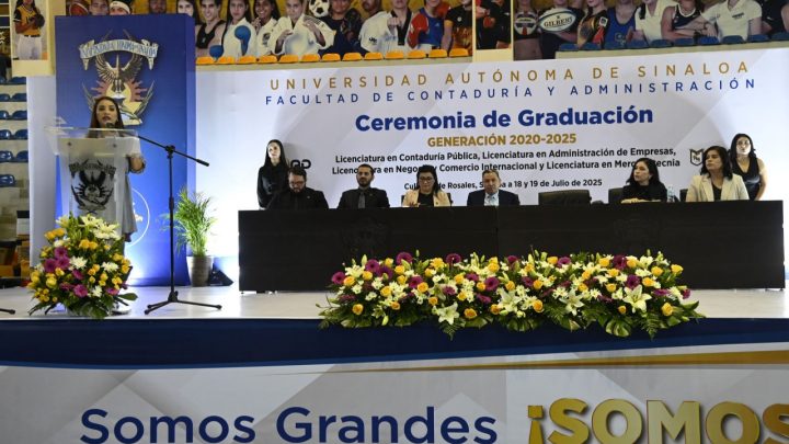 Más de mil 200 egresados de la generación 2020–2025 de la Facultad de Contaduría y Administración (FCA) de la Universidad Autónoma de Sinaloa (UAS), de las licenciaturas en Contaduría Pública, Administración de Empresas, Negocio y Comercio Internacional, y Mercadotecnia, en sus modalidades escolarizada y semiescolarizada, celebraron su ceremonia de clausura, como el reflejo de años de formación integral, que los preparó para contribuir activamente al desarrollo de la sociedad.