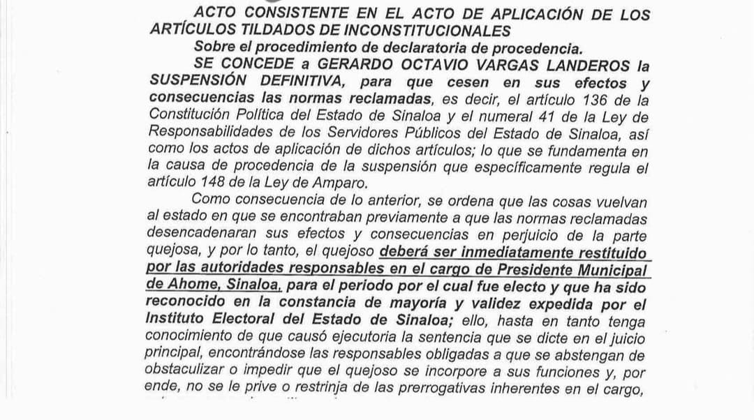 El juez federal de Zacatecas, Rodolfo García Camacho, concedió la suspensión definitiva a favor de Gerardo Octavio Vargas Landeros, ordenando su restitución inmediata como presidente municipal de Ahome para el periodo constitucional 2024-2027. La resolución fue dictada el 29 de julio del 2025 en el juicio de amparo 1832/2025-VI, dentro de una audiencia incidental.