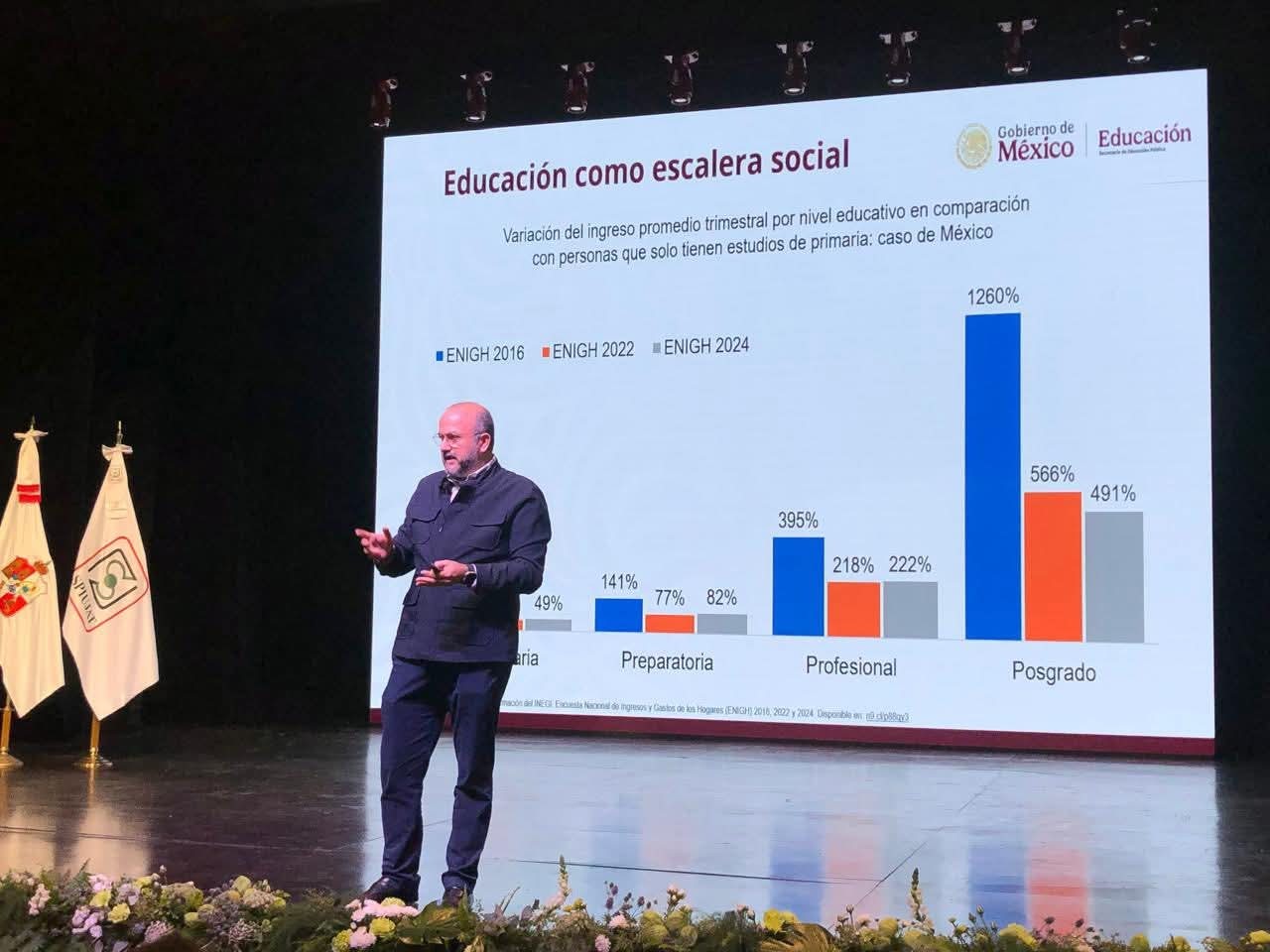 El funcionario federal abordó el tema “Reformas a los Sistemas Universitarios de Pensiones: diagnósticos y lineamientos para la sostenibilidad financiera”; hizo una analogía donde la Autonomía la comparó con el padre que tiene dos hijos con libertad de tomar decisiones y que reciben un financiamiento, donde uno fue responsable en muchos años de ese apoyo que recibía y el otro no, por lo que el padre no puede quitarle dinero al primero para dárselo al otro.