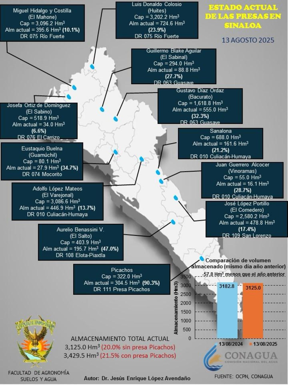 Aunque la captación de agua ha sido mayor a otros años, la recuperación de agua en las presas sinaloenses va lenta con una captación del 20 por ciento a nivel estatal, informó el doctor Jesús Enrique López Avendaño, profesor investigador de la Facultad de Agronomía de la Universidad Autónoma de Sinaloa (UAS).