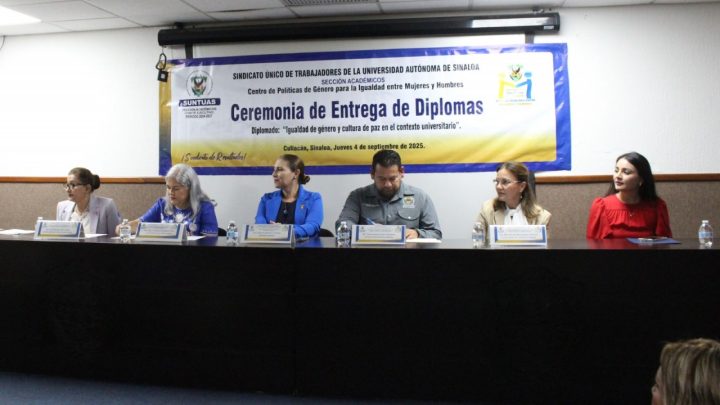 Este jueves 4 de septiembre, la sección Académicos del Sindicato Único de Trabajadores de la Universidad Autónoma de Sinaloa (SUNTUAS) y el Centro de Políticas de Género para la Igualdad entre Mujeres y Hombres (CPGIMH), realizaron la entrega de diplomas a los egresados del Diplomado “Igualdad de género y cultura de paz en el contexto universitario”, impartido del 15 de marzo al 30 de mayo de 2025, durante una ceremonia presidida por el secretario general del SUNTUAS Académicos, el maestro en ciencias Samuel de Jesús Castro Camacho y la directora general del CPGIMH, la doctora Beatriz Eugenia Rodríguez Pérez.