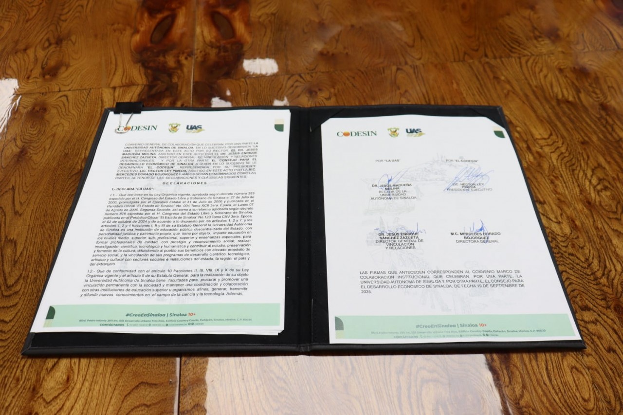 La Universidad Autónoma de Sinaloa (UAS) firmó un Convenio General de Colaboración con el Consejo para el Desarrollo Económico de Sinaloa (CODESIN) y se convierte en la primera institución en establecer una colaboración formal dentro de la estrategia Sinaloa 10 que busca, con una visión hacia el año 2050, posicionar al Estado de Sinaloa entre los 10 más competitivos de México.
