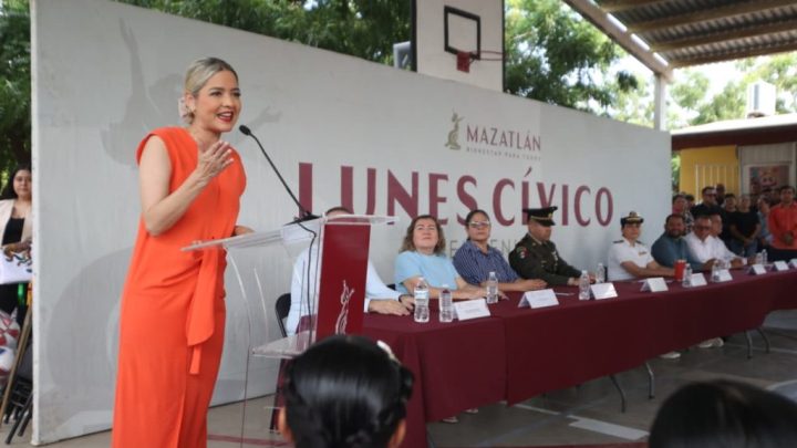 Mazatlán, Sinaloa.- La niñez mazatleca es la razón de todo el esfuerzo y el apoyo a la educación del Gobierno de Mazatlán, afirmó la Presidenta Municipal, Estrella Palacios Domínguez, durante el acto del Lunes Cívico celebrado en la Escuela Primaria Amigos de México, ubicada en la colonia Jardines del Valle.