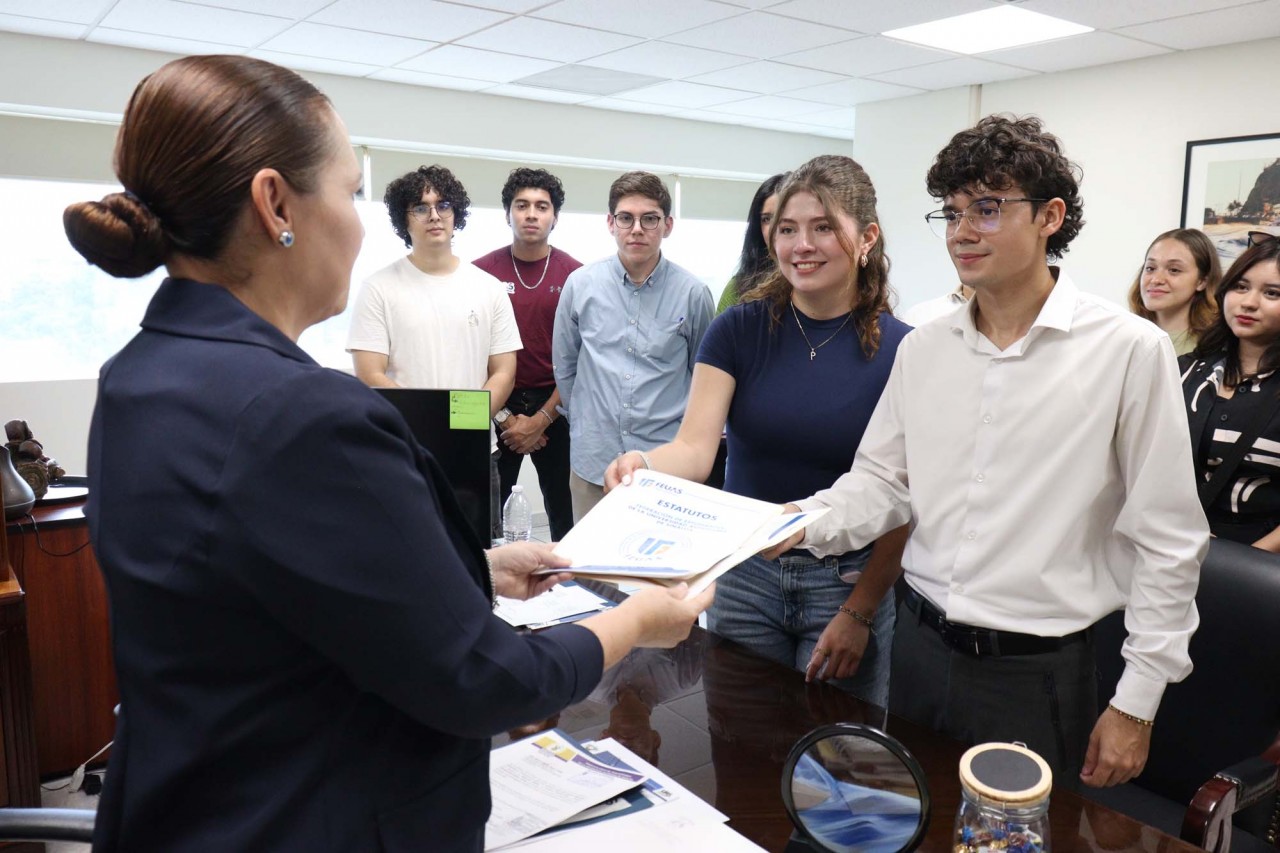 El presidente de la FEUAS, Ángel Gamaliel Quevedo Reyes, y Paulina Aldana, acompañados de otros integrantes de la Federación entregaron a la funcionaria universitaria los documentos que avalan la conformación de la misma y la solicitud de algunos apoyos.