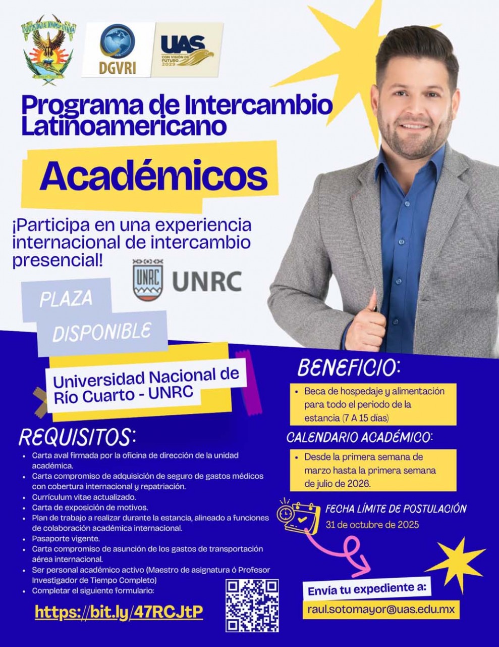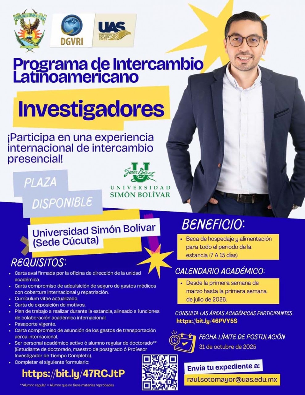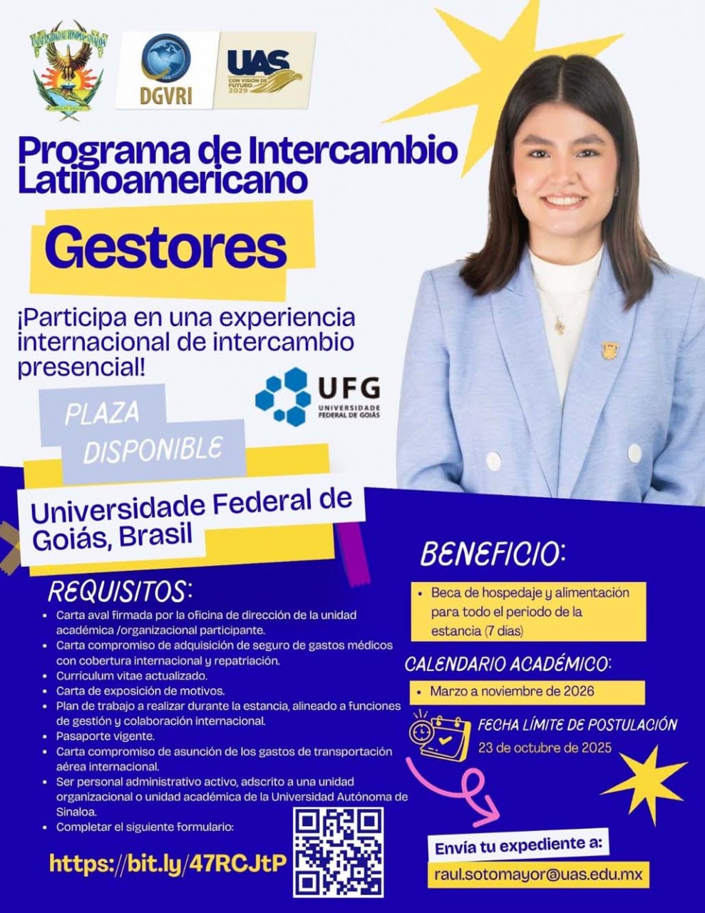 Como parte de la formación integral que promueve la Universidad Autónoma de Sinaloa (UAS), la Dirección General de Vinculación y Relaciones Internacionales (DGVRI), en colaboración con la Asociación Nacional de Universidades e Instituciones de Educación Superior (ANUIES), lanzan la convocatoria para el Programa de intercambio Latinoamericano, para personal académico, investigadores y gestores de la Casa Rosalina.