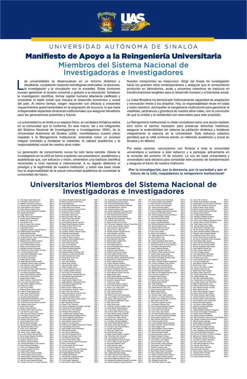 A través de un manifiesto, 436 universitarios miembros del Sistema Nacional de Investigadoras e Investigadores (SNII) convocaron con firmeza a toda la comunidad de la Universidad Autónoma de Sinaloa (UAS) a sumarse a la reingeniería integral y a participar activamente en la consulta del próximo 10 de octubre, señalando que la voz del cada universitaria y universitario será decisiva para consolidar este proceso de transformación y asegurar el futuro de la institución.