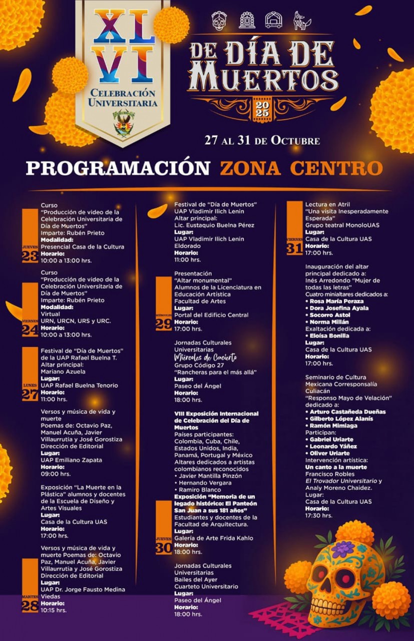 Medina Barreda invitó a toda la comunidad universitaria y sociedad sinaloense a formar parte de esta festividad. El programa de actividades de la XLVI Celebración Universitaria Estatal de Día de Muertos está disponible en la página de Culturauas.mx y en la fanpage Cultura UAS en Facebook.