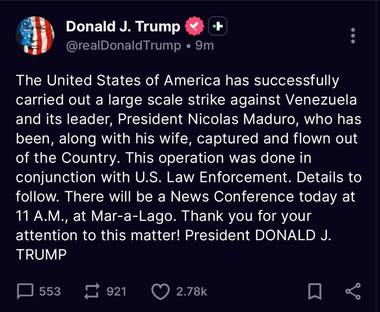 “Los EstadosUnidos de América ha llevado a cabo exitosamente un ataque a gran escala contra Venezuela y su líder, el PresidenteNicolásMaduro, quien ha sido, junto con su esposa, capturado y sacado del país. Esta operación se realizó en conjunto con las fuerzas del orden de EstadosUnidos“.
