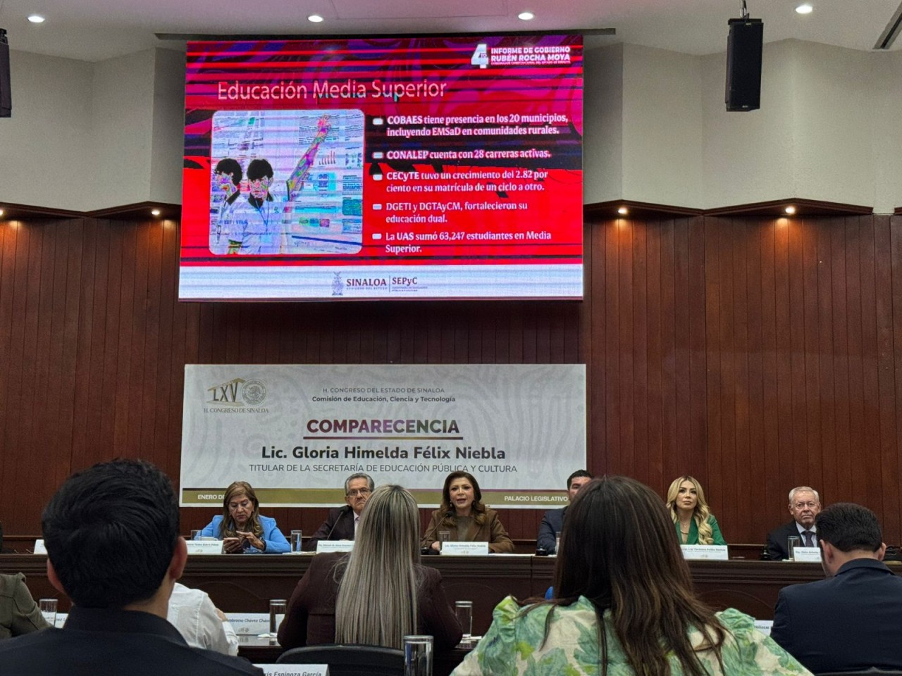 La Universidad Autónoma de Sinaloa (UAS) acompañó los trabajos de la comparecencia de la Secretaria de Educación Pública y Cultura del estado, Gloria Himelda Félix Niebla, realizada ante diputadas y diputados de la 65 Legislatura del Congreso del Estado, en el marco del Cuarto Informe de Gobierno del doctor Rubén Rocha Moya, donde se expusieron los avances y logros alcanzados en materia educativa durante el año 2025.