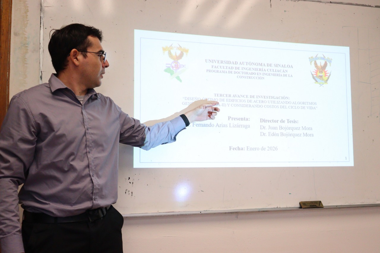 El estudiante de doctorado Fernando Arias Lizárraga dio a conocer los avances de su proyecto de investigación que desarrolla dentro del Doctorado en Ingeniería de la Construcción de la Facultad de Ingeniería de la Universidad Autónoma de Sinaloa (UAS), enfocado en el diseño óptimo de edificios de acero mediante el uso de algoritmos genéticos y el análisis de costos del ciclo de vida.
