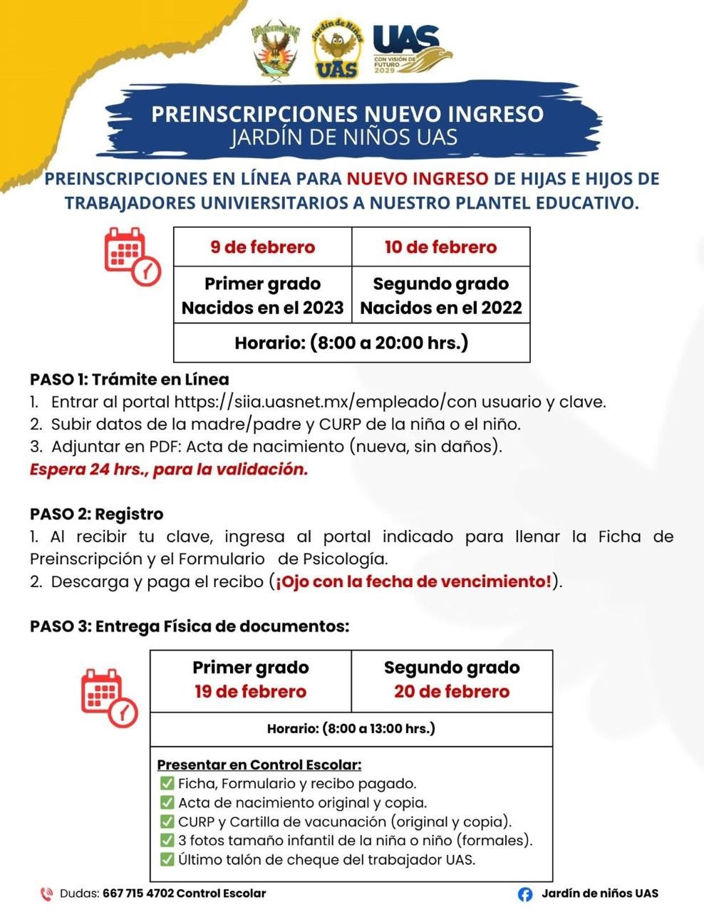 El Jardin de Niños de la Universidad Autónoma de Sinaloa (UAS) el próximo 9 de febrero estará iniciando con el Proceso de Preinscripciones en línea para nuevo ingreso de hijas e hijos de trabajadores de la casa de estudios a este plantel educativo, por lo que en esta fecha sería para el primer grado de pequeños nacidos en el 2023, por lo que se convoca a madres y padres de familia estar atentos e ir preparando la documentación requerida para el momento del trámite, informó Carolina Contreras Barraza.
